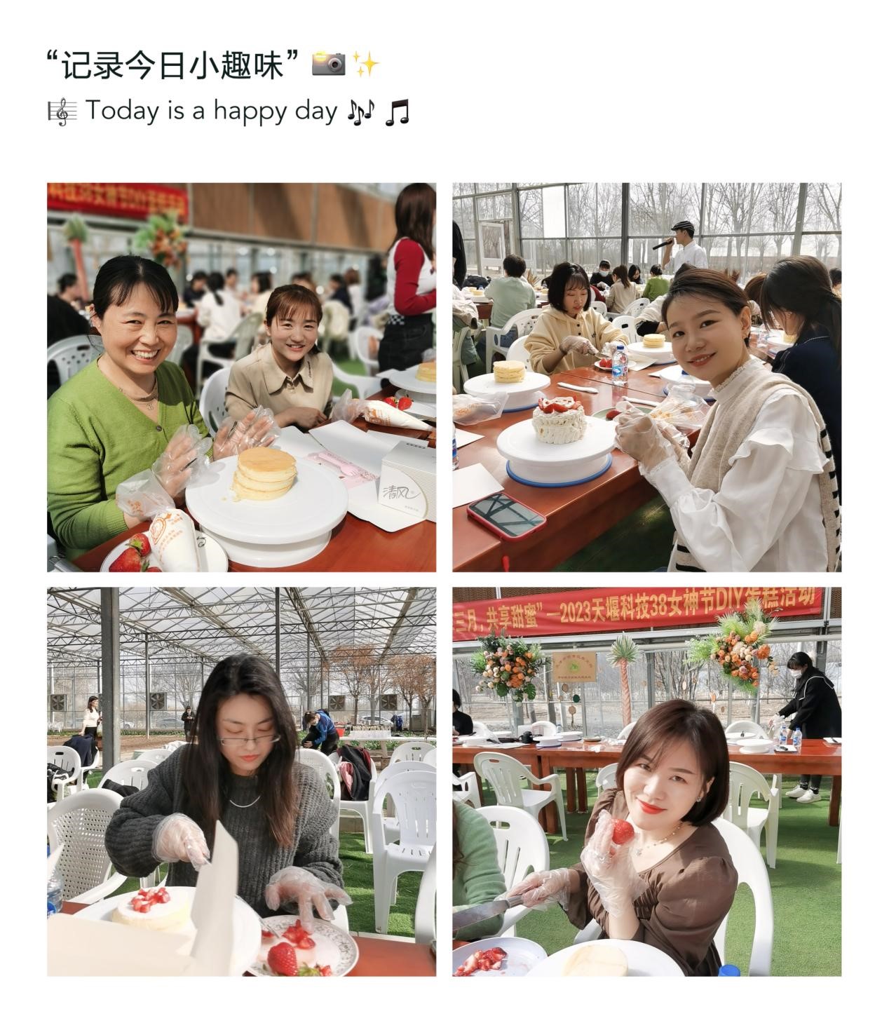春风有信,花开有期,人间芳菲三月天,相约甜蜜女神节,为纪念“三八”国际劳动妇女节113周年,进一步丰富女员工的节日文化生活,加强交流,增进友谊。公司于2023年3月8日下午在草莓园开展了以“芳菲三月,共享甜蜜”为主题的女神节DIY草莓蛋糕及采摘蔬菜活动,为参与活动的全体女员工送上了一份甜蜜的节日礼物。