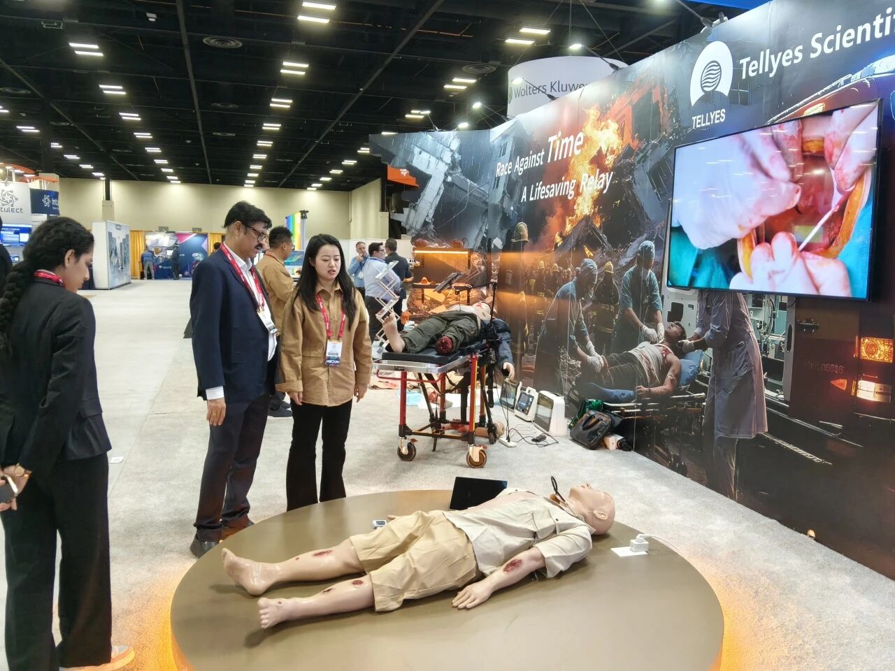 At Tellyes booth, our long-term partner from Russia made a special visit to experience MARS. They engaged with scenario "Severe traumatic hemorrhage": the simulator groaned, even demonstrated loss of consciousness, highly restored traumatic physiological changes, and accurately reflected corresponding shifts in vital parameters. After performing a series of trauma management techniques, they emphasized that Russia currently has a strong need for such advanced simulators to enhance local medical teams' capability in managing complex trauma cases.